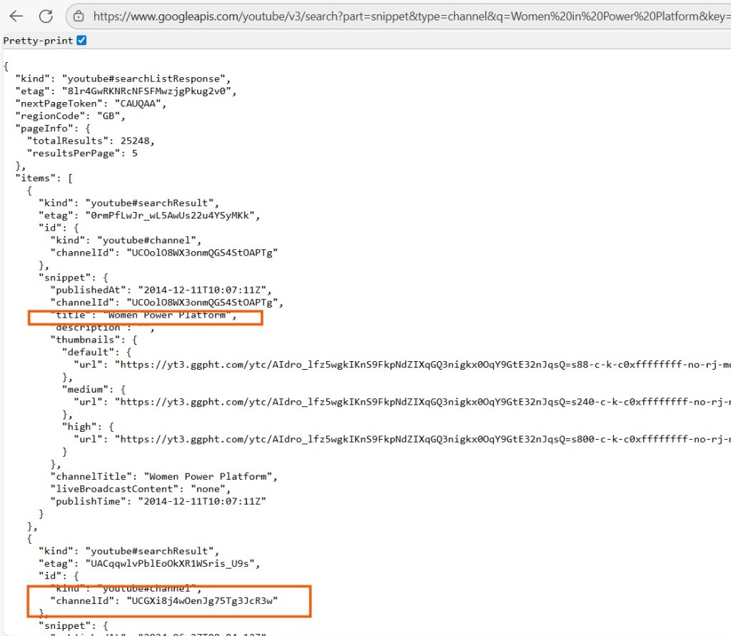 For my bot, I only want results from the Women In Power (Platform) YouTube channel so I needed to find out the channel ID.