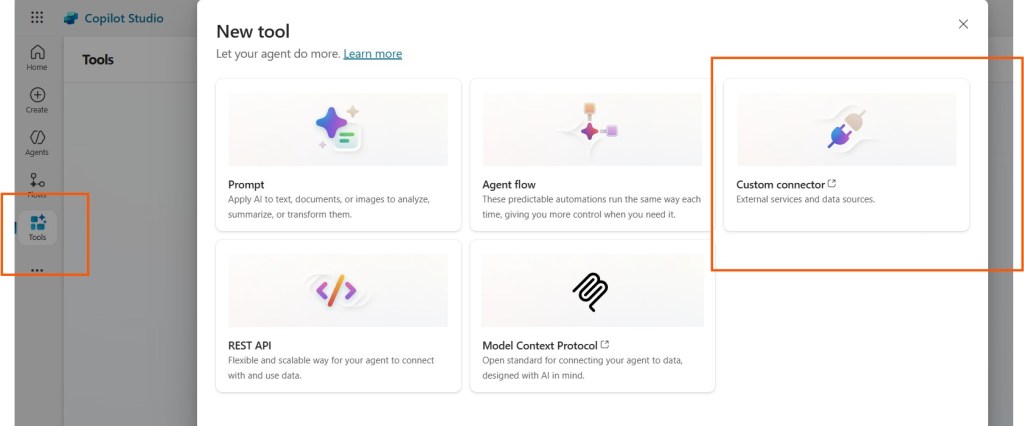 Once the connector worked, I returned to Copilot Studio. Now Copilot Studio is always updating and previously I had added this new connector under ‘Actions’ but now I think it has moved to ‘Tools’.